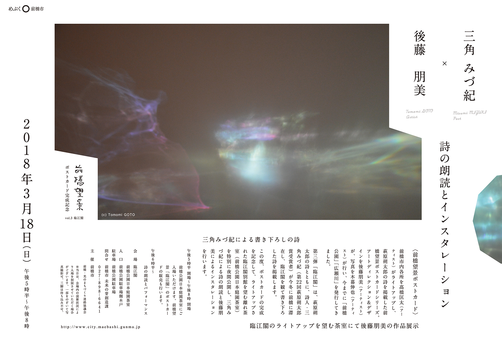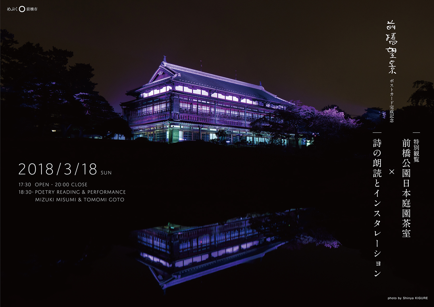 この度、ポストカードの完成を記念して、ライトアップされた臨江閣別館を望む離れ茶室(前橋公園日本庭園茶室)を特別に夜間公開し、三角みづ紀による詩の朗読と後藤朋美による作品展示をいたします。