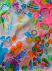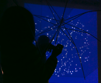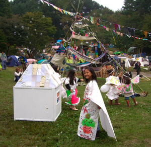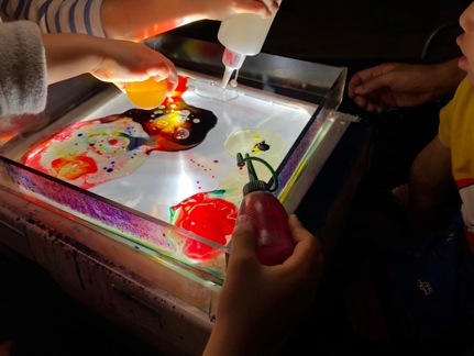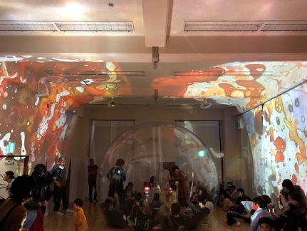 内と外との光できらきらと輝くドームと、描いた絵がOHPプロジェクターで壁一面に映し出され空間を彩る、時間に絵を描くワークショップ。宇宙のような光と動く絵の中で、ドームが惑星の様に浮かびました。
